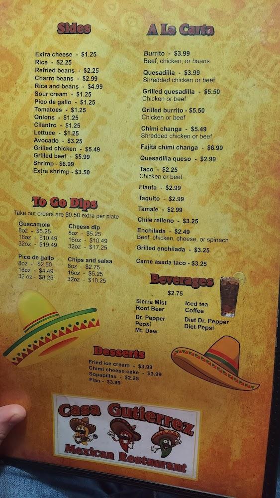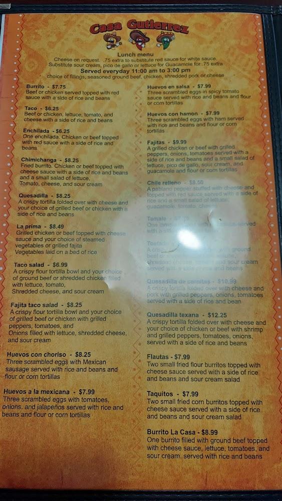 Casa Gutierrez's menu spans an impressive variety of dishes. Appetizers like guacamole and nachos kick off the meal while tacos and enchiladas showcase authentic flavors. Family-friendly options include a kids menu packed with favorites. Daily specials highlight local ingredients and creativity. Desserts such as fried ice cream end meals on a sweet note. The bar serves cocktails and a variety of beverages, ensuring everyone finds something they love.
